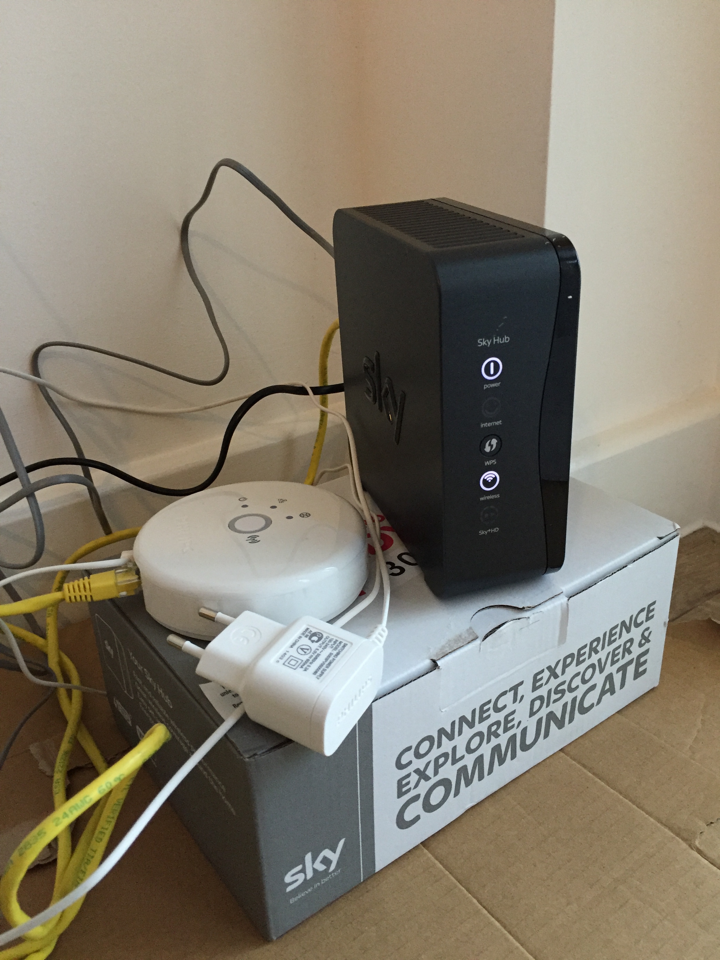 Gestern ist der Router von Sky mit der Post gekommen. Bis wir allerdings Internet haben dauert es noch ein paar Tage. Aber zumindest funktioniert mit dem die Hue (per App steuerbare Lampe). Der andere Router hat sich immer neu gestartet wenn die Hue versuchte sich zu verbinden (oder war es die Hue die den Router killte?).