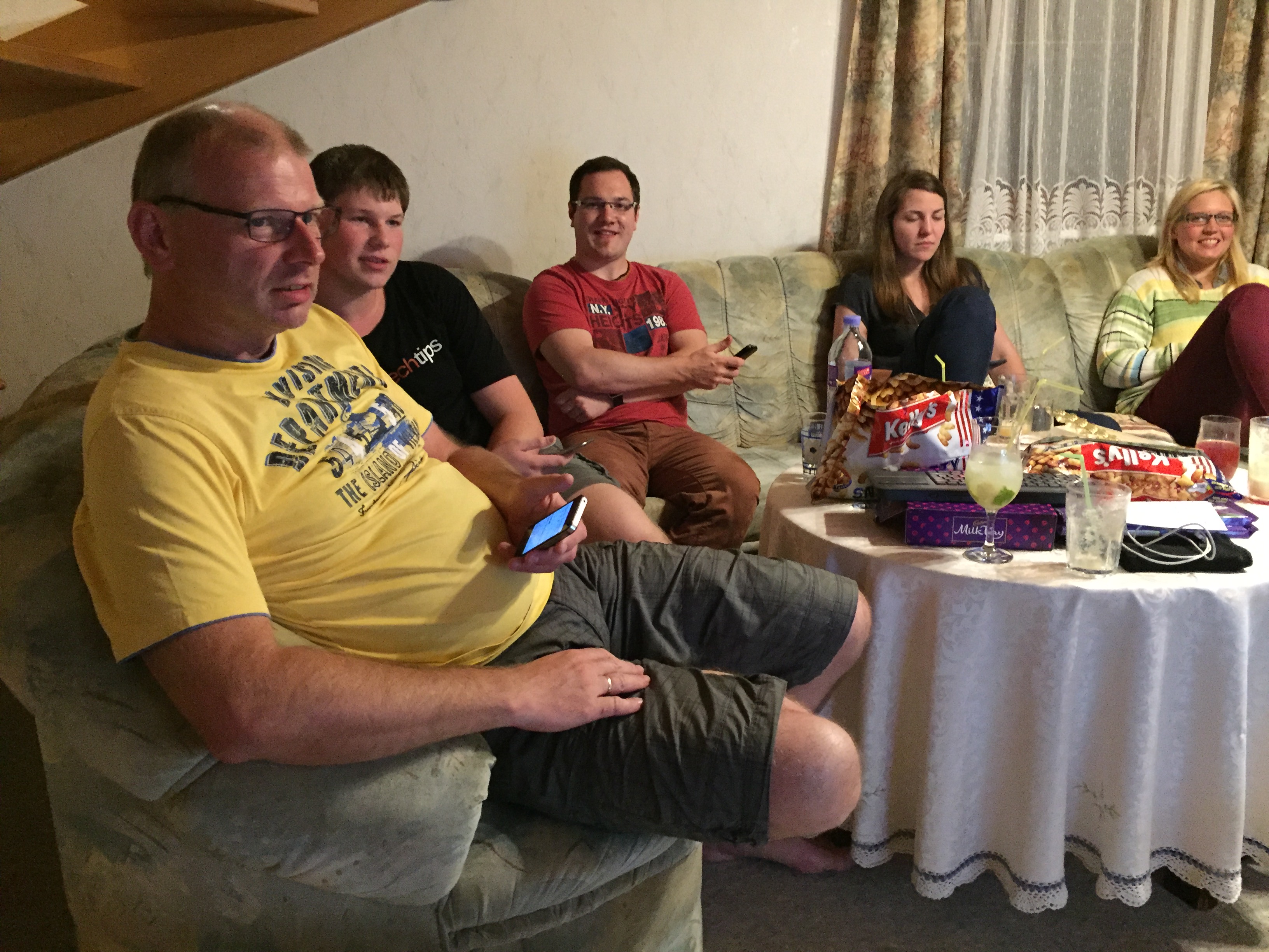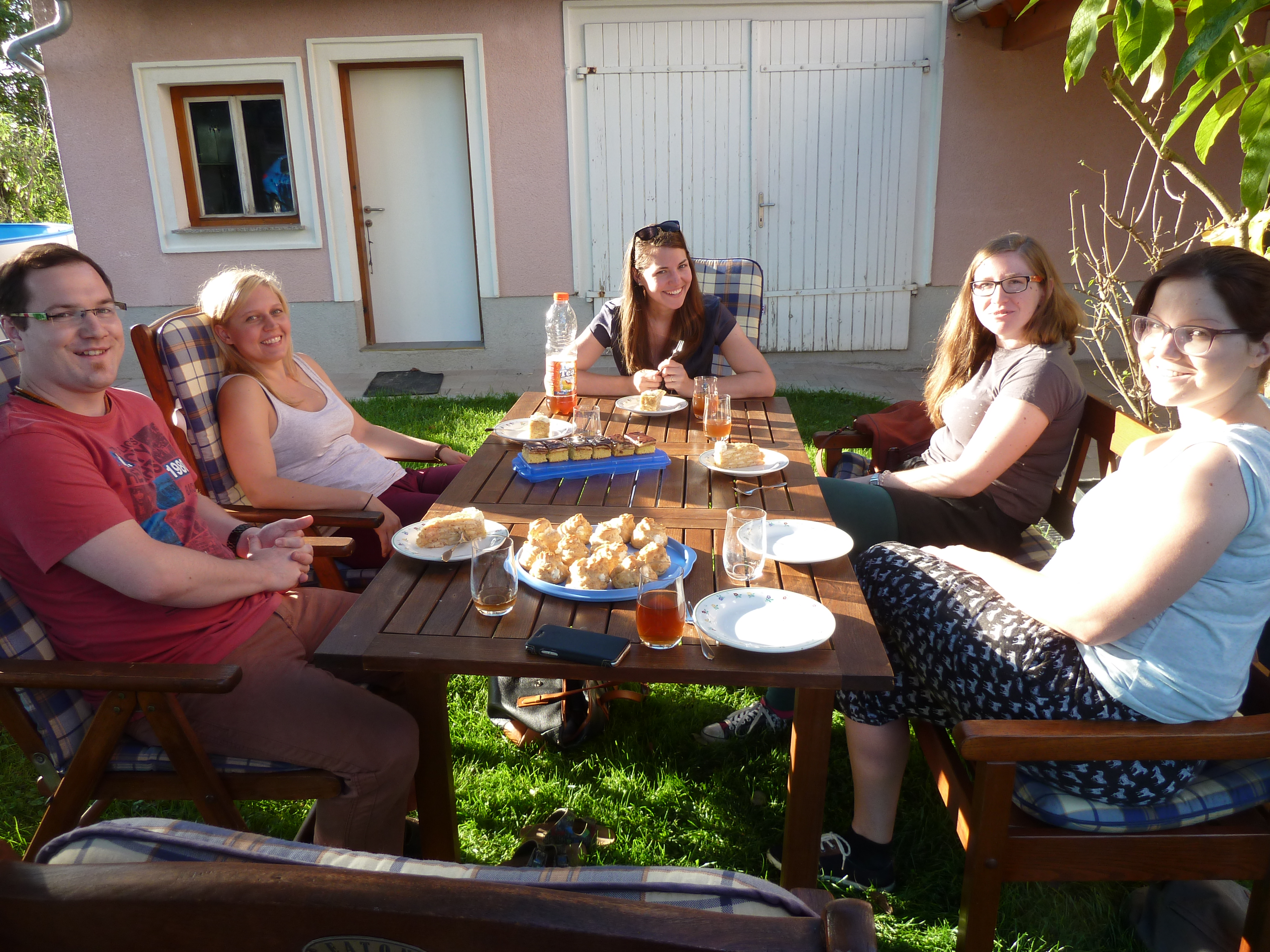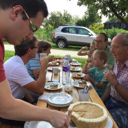 Am Freitag vormittag gab es noch einiges zu tun, wir suchten zusammen was wir nach England mitnehmen wollten und Mama half mir (oder eher: ich half ihr) bei den Vorbereitungen für später. Am Nachmittag kamen dann nochmal eine ganze Menge Verwandten zusammen und wir genossen im Hof gemeinsam Xhris‘ Geburtstags-Malakoff-Torte ?, die Regina extra noch gestern Nacht gemacht hatte und Mama’s allseits beliebte Bananenschnitte.